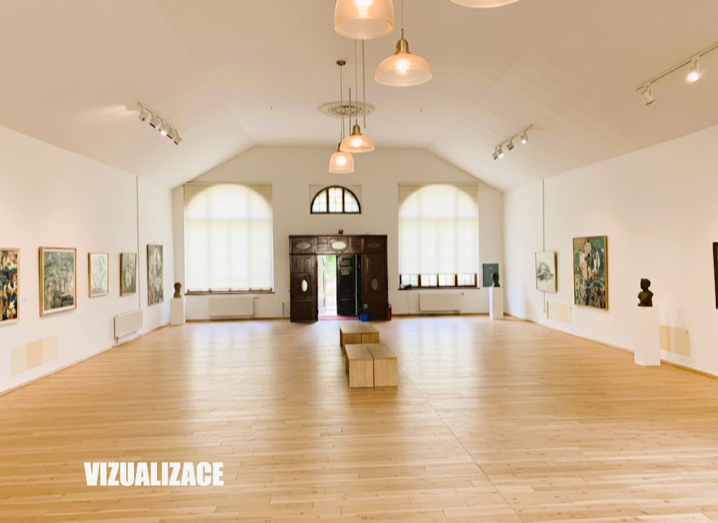 - interiér je tvořen velkorysými sálovými prostory, menším sálem a vřetenovým schodištěm v zadní části budovy